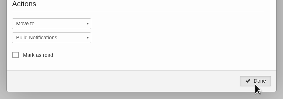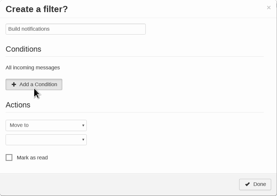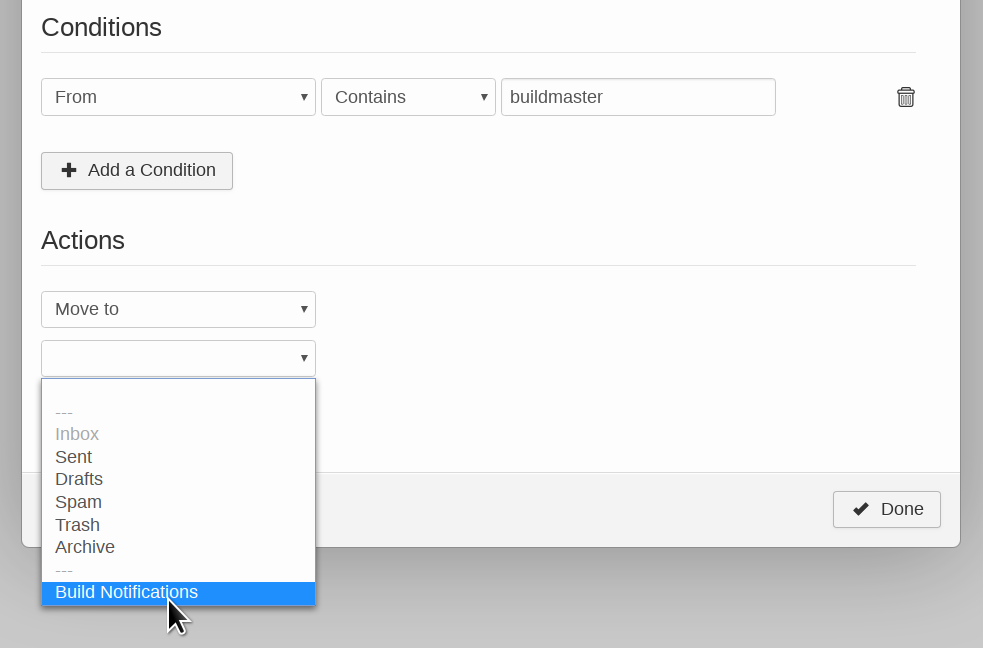 Add one or more conditions, e.g. “From”, “Contains”, “buildmaster”. Select the Move to action, and choose a destination folder.