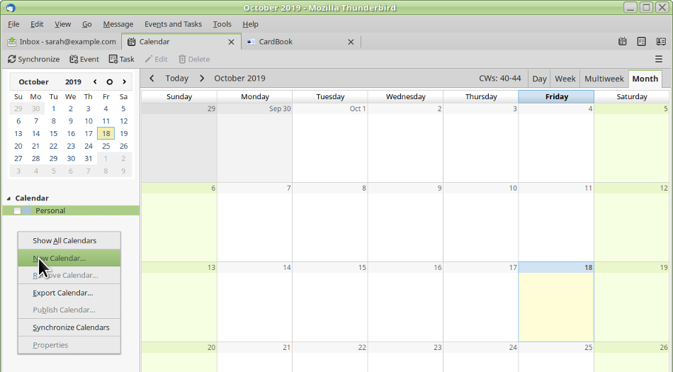 Go to the File > New > Calendar… (or right-click in an empty area under the mini-calendar, and choose New Calendar…)