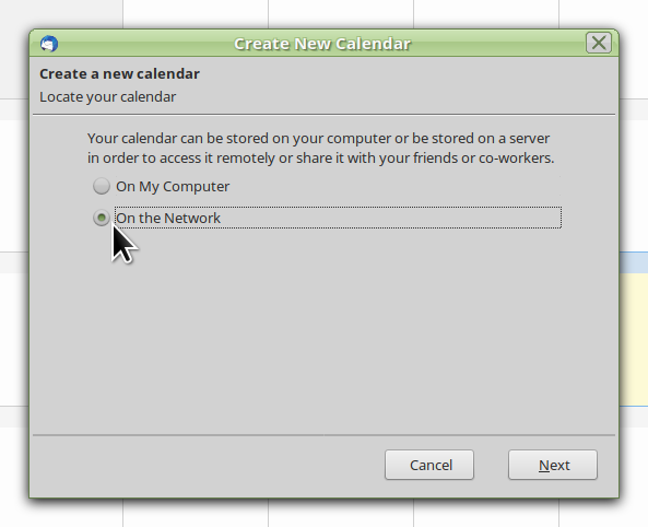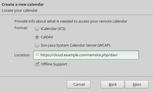 Select the CalDAV format, and enter the calendar location URL: https://cloud.inclusioproject.com/remote.php/dav/.