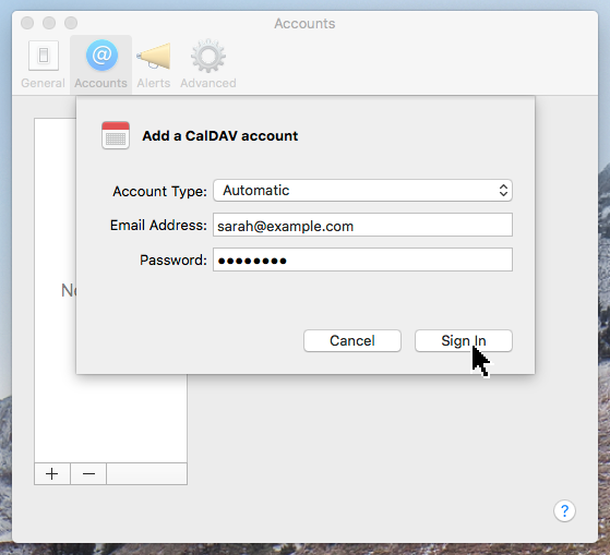 Click Sign In. The Calendar app will query the base URL from your email address for both CalDAV, and use whatever it finds.