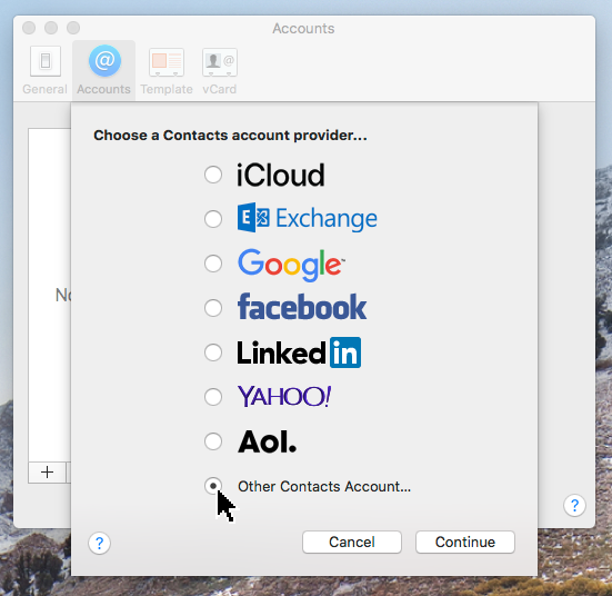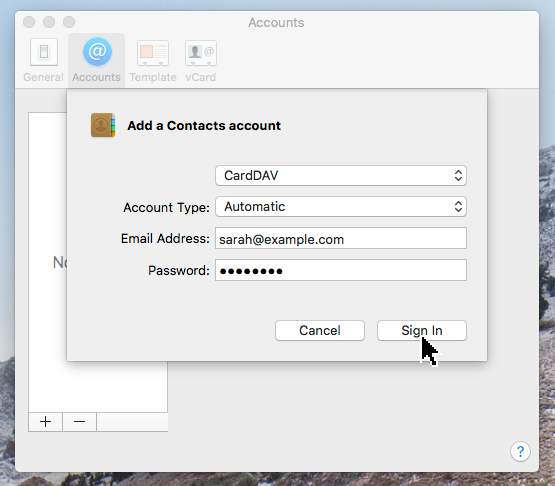 Click Sign In. The Contacts app will query the base URL from your email address for both CardDAV, and use whatever it finds.