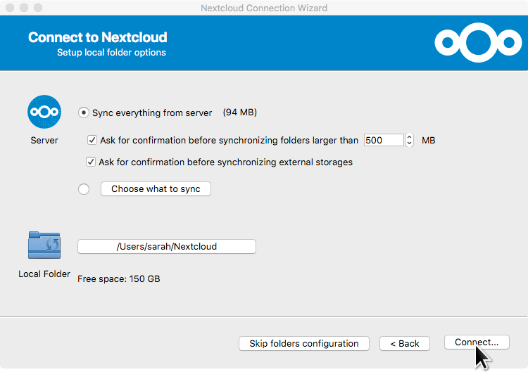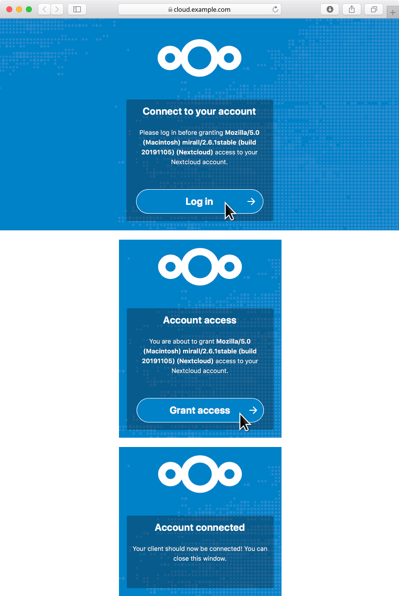 A web browser will pop up, and you’ll be asked to log in to your Cloud server account, and grant access to the sync app.